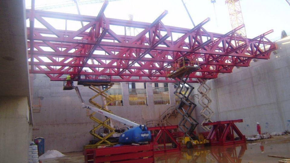 ROVINJ-konstrukcijaU tijeku je postavljanje nosive čelične konstrukcije sportske dvorane Srednje škole "Zvane Črnja" u Rovinju. Natječaj, na kojemu je naš ured dobio prvu nagradu proveden je početkom 2005g.